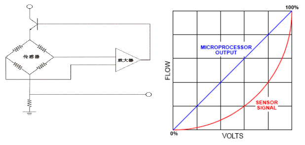 熱式氣體質(zhì)量流量計有一堅(jiān)固、可清潔的熱式(shì)質量流量傳感🛀器(qì)組合。此組合由兩(liǎng)個RTD(電阻溫度(du)探測器)傳感(gǎn)組件組成,其材料(liao)是級鉑電阻和陶(táo)瓷。兩個鉑電阻傳(chuán)感器🐆附于陶瓷基(ji)闆上,外加一細長(zhang)的不鏽鋼保護套(tào)。此傳感器組合♉是(shi)溫度補償的,且對(dui)壓力變化不敏感(gan),無需壓力修正。流(liu)經加熱傳感組件(jiàn)的氣體質量流量(liang)是通⭐過傳感組件(jian)的熱傳遞量來計(ji)🥰量的。氣體速率增(zēng)加,傳感器傳遞給(gěi)流體的熱量增多(duō),因此需要供給更(gèng)多的電流,以維持(chí)傳感組件的恒定(ding)溫度差△T。此熱(re)傳遞正比于氣體(tǐ)質量流速(密(mi)度*流速)。變送器輸出的電(dian)流對應于流量或(huo)流速。傳感器、橋路(lù)放大✏️器、外殼、探頭(tou)組成流量變送器(qi)。來自變送器的信(xìn)号通過處理标💰校(xiào)轉換爲線性信号(hào),線性信号輸出設(she)爲0-5VDC和4-20mA。4-20mA輸出可帶動500歐負載(包括線(xiàn)路電阻和負載),傳(chuan)感器工作原理圖(tu)及流🈲量🏃于電壓關(guān)系圖如下: