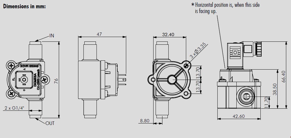 FHKSC 系列小流量(liang)計 FHKSC 系列産品 典型應用(yong):水、咖啡、紅酒(jiǔ)、烈性酒及有(yǒu)輕微腐蝕性(xìng)的液體。 技術特性: 管道連接(jie): 6mm 軟(ruan)管連接 ( 進口與(yu)出口可以旋(xuan)轉爲四個不(bu)同方向,便于(yú)安裝 ) 通徑 :1.2mm , 1.8mm 流量: 0.075-0.89L/min 壓力: 20℃ 時 -1Bar—0.3Bar 溫度(du)範圍: -10℃-65℃ 測量精度(du):小于 2% 重複測量(liang):< +/-0.25% 驅(qū)動電壓: 4.5-24VDC 主要适(shi)用于:水,咖啡(fei),紅酒,烈性酒(jiu)及有輕微腐(fǔ)蝕性🥰的液體(ti) 殼體和(he)軸支柱材料(liào): ARNITE 和(hé)PVDF