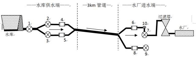 2 、 圖中 1 号(hao)閥門和 2 、 3 号(hao)閥門相距(jù) 20m 左右; 2 号閥(fá)門和 4 号電(diàn)磁流量計(jì)相距 15m 左右(you), 3 号閥門和(hé) 5 号電磁流(liú)量計也相(xiang)距 15m 左右; 6 号(hào)電磁流量(liang)計和 7 号閥(fa)門相距 20m 左(zuǒ)右,中間有(yǒu)個水平 90° 的(de)直角彎, 7 号(hao)閥門後面(mian)是高約 8m 的(de)過濾塔; 9 号(hao)閥門爲水(shui)廠備用管(guǎn)道,爲常閉(bì)狀态;