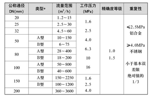 1、流量(liàng)計規格(gé)、基本參(cān)數和性(xìng)能指标(biao)(見表1)